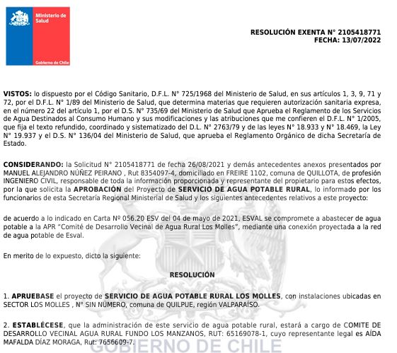 Aprobación Proyecto APR Los Molles por la Seremi de Salud